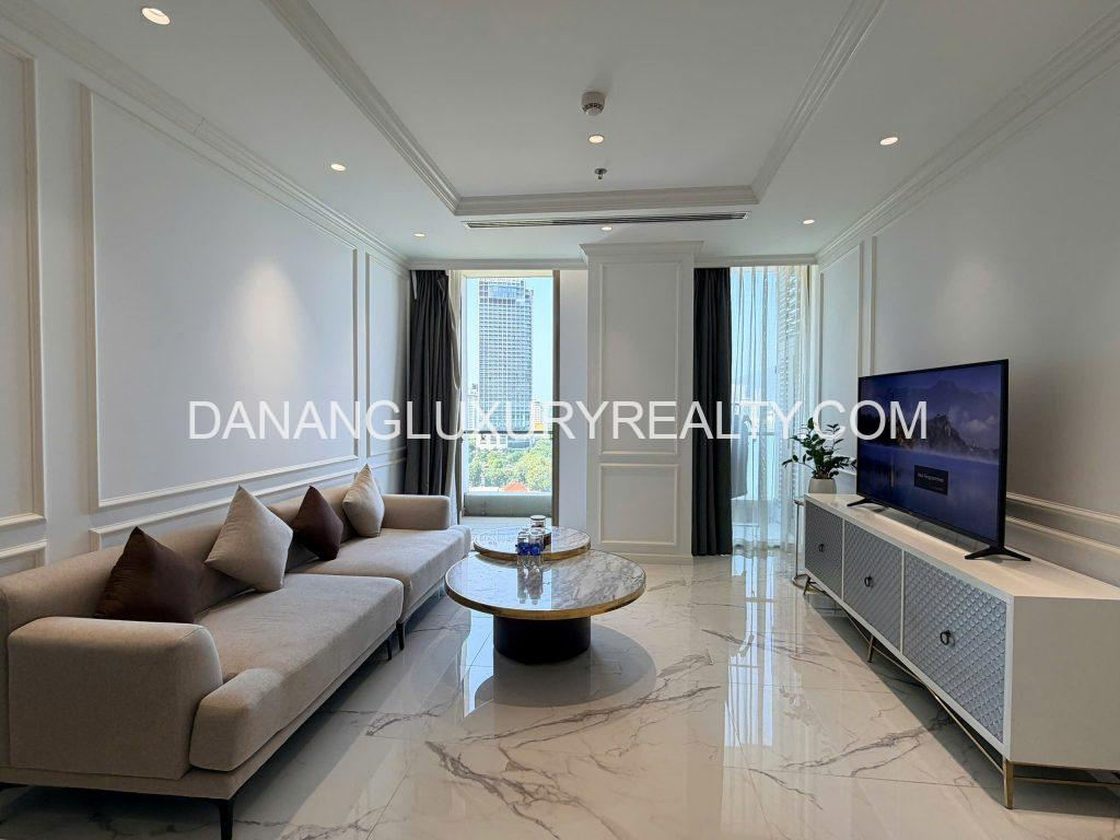 Apartment for rent at Bach Dang Complex Da Nang featuring a spacious 120m² layout with 2 bedrooms and 2 bathrooms. Fully furnished with modern, high-end interiors in an elegant white tone, the apartment offers a bright and airy living space with large windows and a northeast-facing balcony overlooking the Han River. Located on Bach Dang Street in the city center, residents enjoy convenient access to restaurants, cafes, and entertainment areas. This property is ideal for expatriates, professionals, and long-term tenants seeking a luxurious and comfortable riverfront lifestyle in Da Nang.